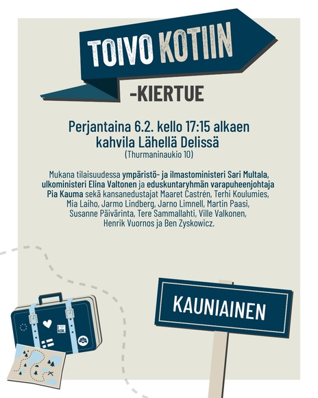 Kokoomuksen eduskuntaryhmä kiertää ympäri Suomen Toivo kotiin -kiertueen merkeissä kohtaamassa ihmisiä. Tervetuloa tapaamaan kansanedustajia Lähellä Deliin (Thurmaninaukio 10) perjantaina 6.2. klo 17.15 alkaen. Mukana tilaisuudessa ympäristö- ja ilmastoministeri Sari Multala, ulkoministeri Elina Valtonen ja eduskuntaryhmän varapueenjohtaja Pia Kauma sekä kansanedustajat Maaret Castrén, Terhi Koulumies, Mia Laino, Jarmo Lindberg, Jarno Limnell, Martin Paasi, Susanne Päivärinta, Tere Sammallahti, Ville Valkonen, Henrik Vuornos ja Ben Zyskowicz. Muutokset osallistujissa ovat mahdollisia.