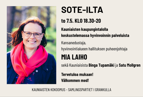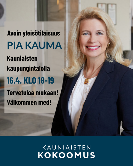 Kansanedustaja Pia Kauma vierailee Kauniaisten kaupungintalolla torstaina 16.4. klo 18-19. Aiheena on kansainvälinen polittiinen tilanne ja sen vaikutus Suomeen. Tervetuloa mukaan keskustelemaan!