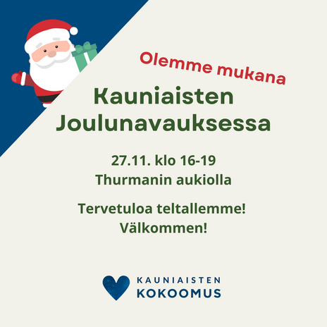 Olemme mukana perinteisessä kauniasiten joulunavauksessa. Löydät torstaina 27.11. Kokoomuksen teltan toriaukiolta. Tule tapaamaan kaupungin sekä hyvinvointialueen päättäjiä ja keskustelemaan ajankohtaisista aiheista.