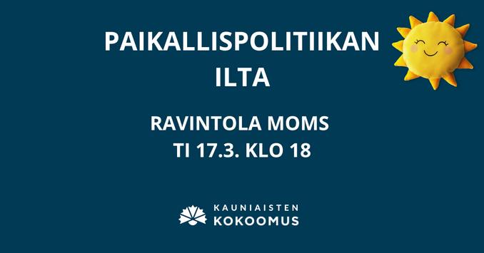 Tule mukaan paikallispolitiikan iltaan Kauniaisten Moms-ravintolaan tiistaina 17.3. klo 18 alkaen. Keskustellaan yhdessä ja kasvotusten ajankohtaisista aiheista. Mukana on runsaasti valtuutettuja ja valiokuntien jäseniä.