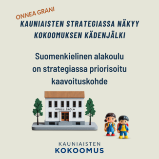 Kunnat ovat sivistyksen kehto. Tasokas varhaiskasvatus ja koulutus ovat tärkeitä lapsiperheiden palveluita. Laadukas, tasa-arvoinen ja turvallinen oppimisympäristö tarkoittaa, että pidämme huolen myös kaikkien kielellisen osaamisen kehittymisestä. Osana laadukasta opetusta on toimiva kielikylpypolku. Suomenkielinen alakoulu on strategiassa priorisoitu kaavoituskohde.
