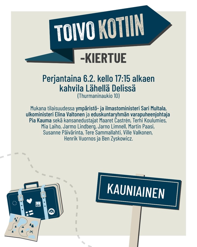Kokoomuksen eduskuntaryhmä kiertää ympäri Suomen Toivo kotiin -kiertueen merkeissä kohtaamassa ihmisiä. Tervetuloa tapaamaan kansanedustajia Lähellä Deliin (Thurmaninaukio 10) perjantaina 6.2. klo 17.15 alkaen.