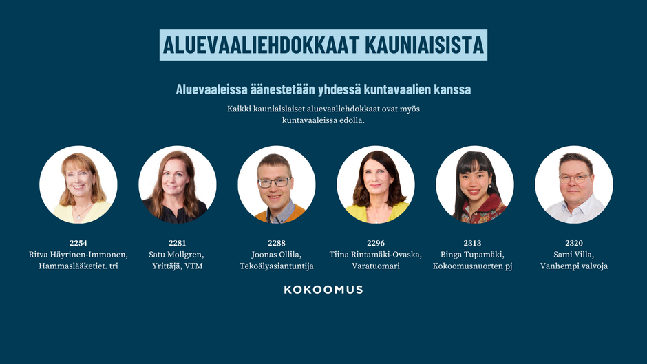 Aluevaaleissa äänestetään ehdokkaita Länsi-Uudenmaan hyvinvointialueen aluevaltuustoon. Kaikki länsi-uusmaalaiset voivat äänestää aluevaaleissa kauniaislaisia aluevaaliehdokkaita. Kaikki Kauniaisten kokoomuslaiset aluevaaliehdokkaat ovat ehdolla myös kuntavaaleissa.